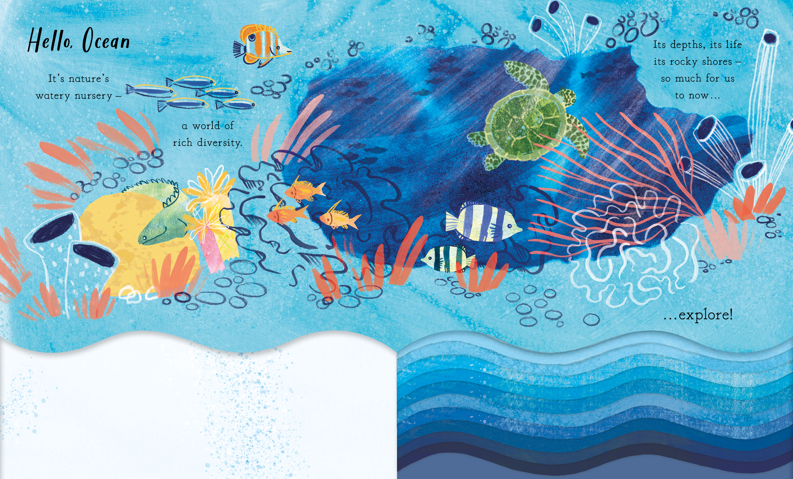 A stunning first ocean book told in gentle rhyme, with beautiful die-cuts throughout. Journey from rocky shores to shimmering depths, and meet the creatures who call them home.