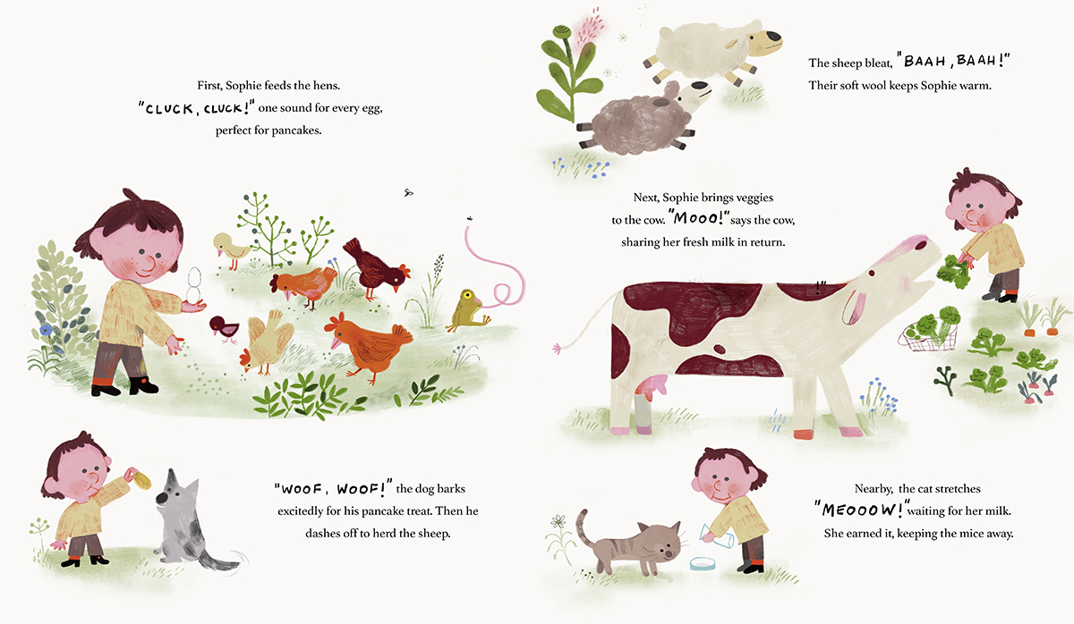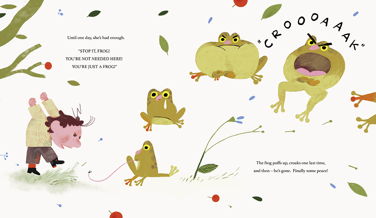 Welcome to Sophie’s farm, where hens cluck, cows moo, and the dog barks for pancakes! Life is peaceful, filled with the friendly sounds of happy animals – except for one. The loud, croaky frog by the pond drives Sophie crazy. When Sophie chases away the frog she thinks is "just a frog," everything on her farm starts to fall apart. No eggs! No milk! Mosquitoes everywhere! Could that pesky croak have been more important than Sophie thought?